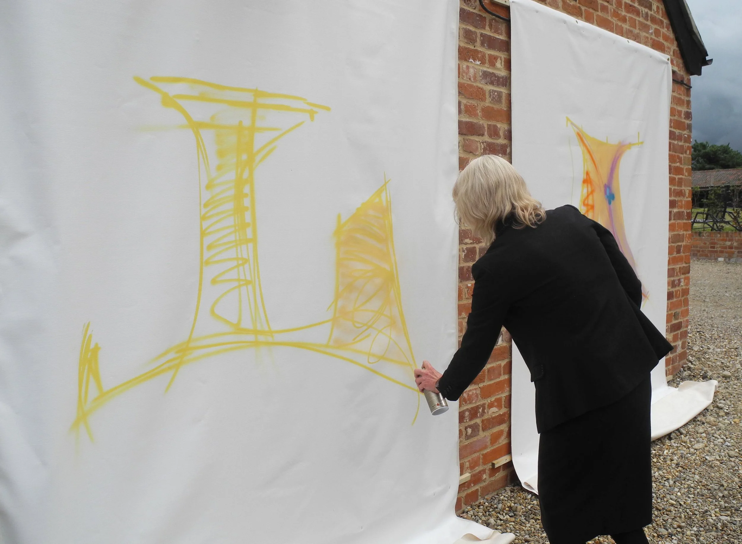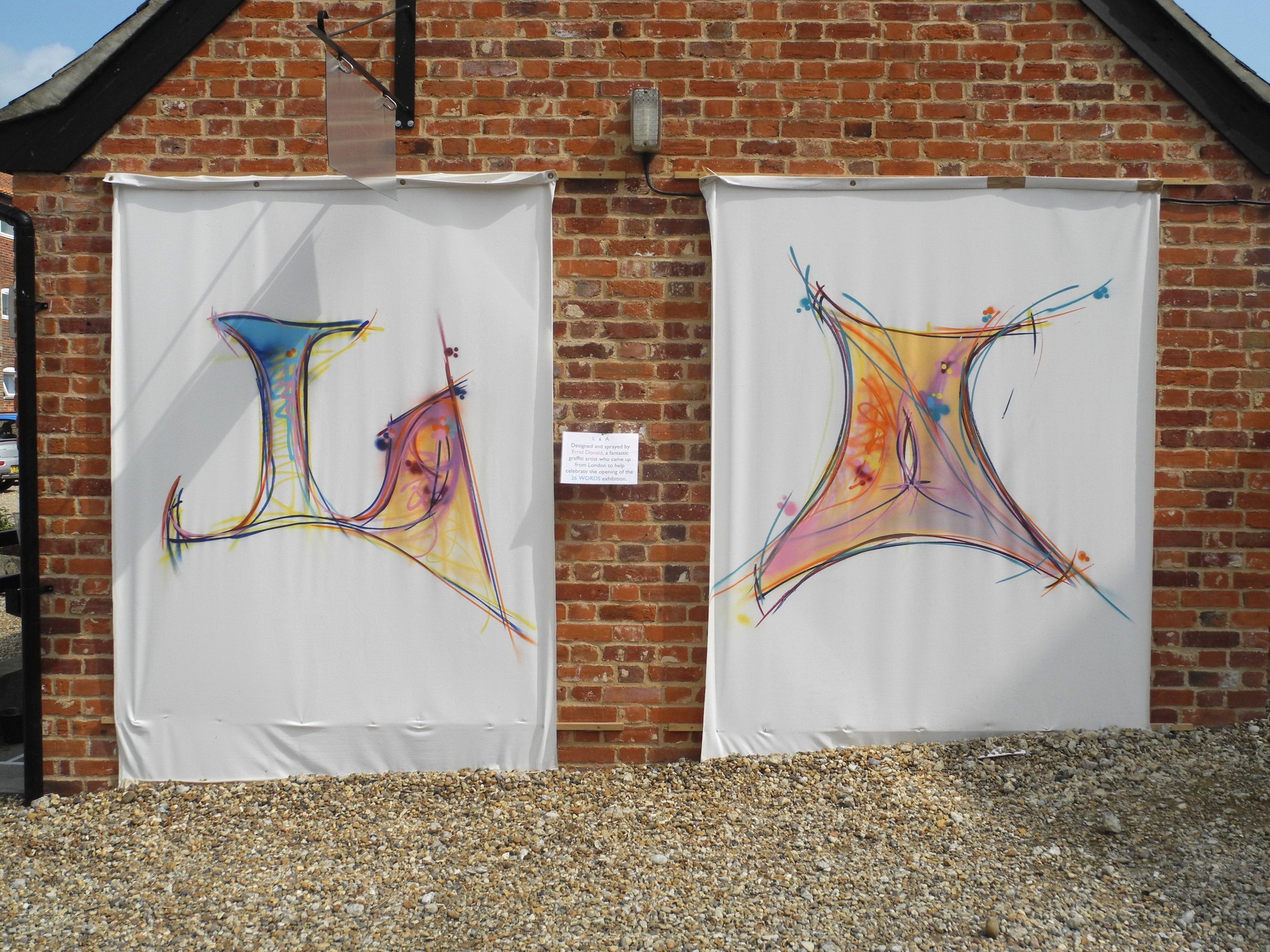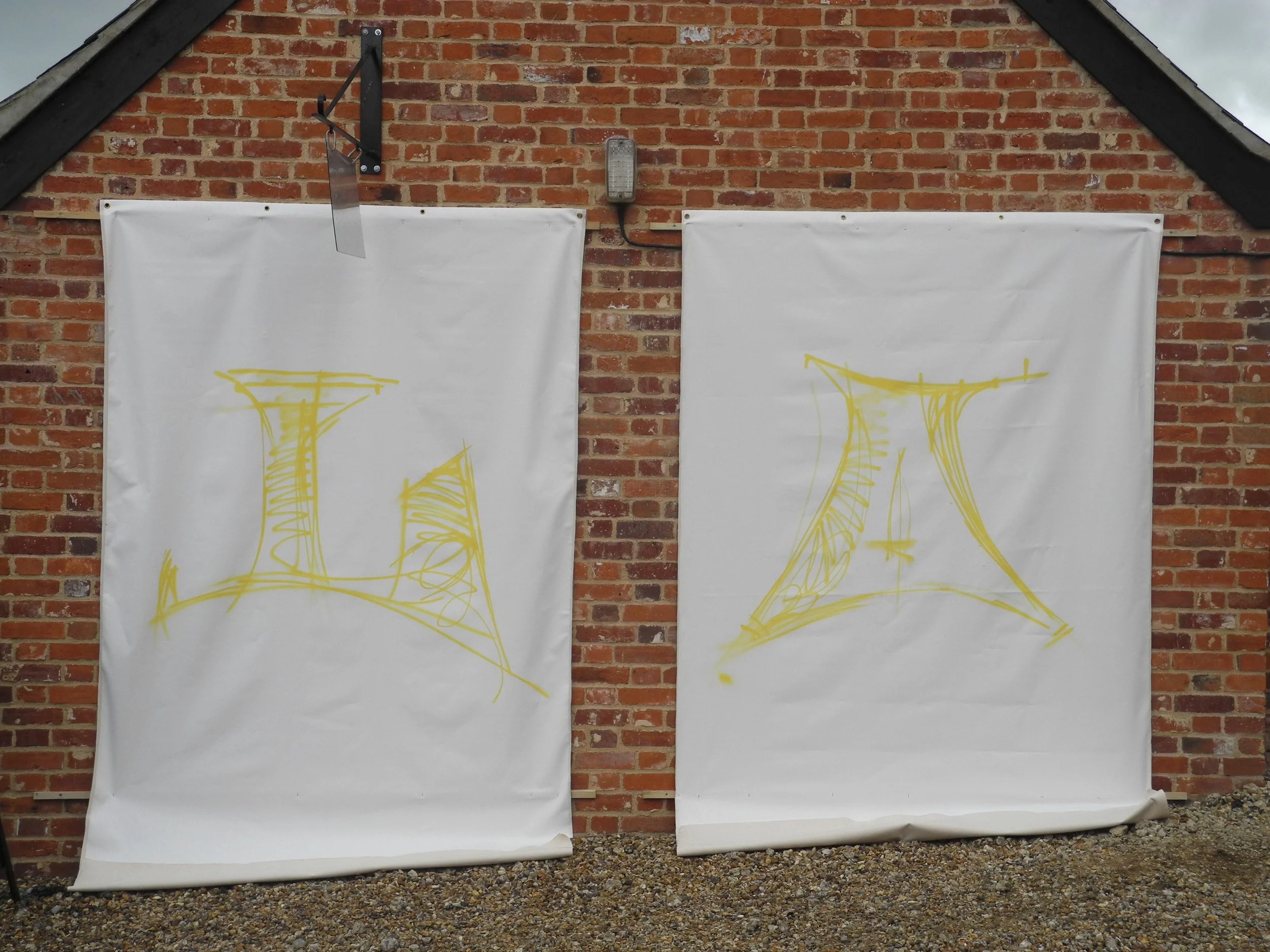 That was my starting point when I arrived at the exhibition site. My space was the end wall of the Lettering Arts Centre where two large canvases had been set up. It was semi-sheltered, open enough for ventilation but away from the main flow of visitors. The brief was simple: respond to the exhibition theme, bring my own language to it and let the process unfold.